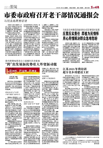 马明龙强调,今年是实现“十四五”规划收官之年,我们将完整准确全面贯彻新发展理念,统筹抓好改革发展稳定各项工作,高质量完成“十四五”规划目标任务,为实现“十五五”良好开局打牢基础,努力为全国全省大局多作贡献。希望老领导们继续发挥政治优势,找准政治引领的切入点,更加深刻领悟“两个确立”的决定性意义,坚决做到“两个维护”,持续把谆谆嘱托转化为不竭动力;发挥经验优势,找准服务大局的发力点,紧盯发展献良策,广纳民意汇民智,发挥专长聚合力;发挥威望优势,找准引领风尚的关键点,进一步提振信心、鼓舞人心、凝聚民心,为奋力谱写“镇江很有前途”新篇章贡献更多“银发力量”。