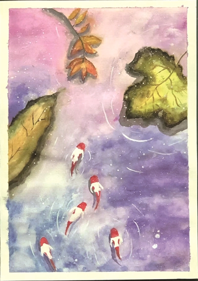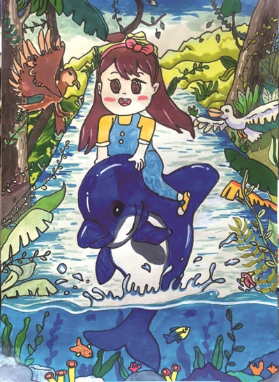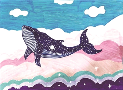看着这幅画,我好像进入了一个奇妙的童话世界。我想象着自己骑在鲸鱼的背上,和它一起在天空中自由自在地飞翔,去探索那些未知的地方。这只飞翔的鲸鱼给我带来了无尽的欢乐和想象,它是我心中最奇妙的伙伴。(指导老师 仇建慧)
