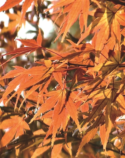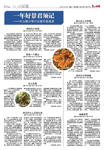 南山的树林很美。有银杏树,有枫树,有品种不一的果树……秋姑娘一招手,银杏叶们便说着笑着、跑着闹着离开了妈妈的怀抱。它们有的在风里翩翩起舞,像一只只金色的蝴蝶,美丽极了;有的像顽皮的孩子,翻着筋斗落在地上;有的在空中飘荡,让南山好像下起了扇子雨,好看极了。枫树红红的,向人们招手,好像在说:“欢迎来到南山!”一棵棵果树则像士兵一样,站在那里保卫着又大又甜的果子。