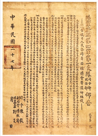 胡木青的说法得到了曾追踪调查该布告来历的荣炳中学原副校长、今年86岁的凌全福老师的印证。“整张布告由小楷抄写而成,字迹清秀,笔画工整,乍一看以为是印刷版。”曾奔波数年,走访多位接触过布告当事人的凌老师介绍,1938年夏,号召各方力量一致抗日的《陆军新编第四军第一支队司令部政治部布告》样稿,由接受培训的荣炳曲阳一带骨干青年胡天喜、胡明法带回,由胡铭佳(新中国成立后曾任镇江市宝塔路小学校长)抄写后,交给上坝村的新四军战地服务团战士王章子出去张贴。
