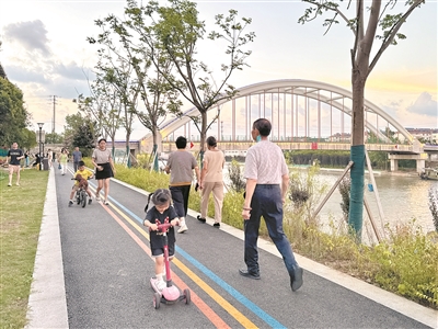 日前,居民在苏南运河丹徒辛丰段岸旁的彩虹步道上散步休闲。经过苏南运河丹徒段沿河环境提升,辛丰镇沿河景观全面提升,水清岸绿景美,彩虹步道已然成为当地热门打卡点。谢道韫 摄影报道