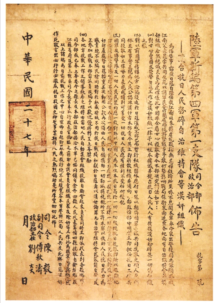 令胡明茄老师没有想到的是,当年他冒着生命危险抄写的新四军布告,被另一个张贴布告的新四军游击队员王章子舍命保护了下来(《镇江日报》于2015年8月3日曾作报道)。上世纪八十年代重见天日后,被鉴定为国家一级革命文物,原件珍藏于中国革命历史博物馆,复制件在宝堰新四军四县抗敌总会纪念馆、茅山新四军纪念馆、溧阳新四军江南指挥部纪念馆长期展出,教育一代又一代的党团员、青少年学生。