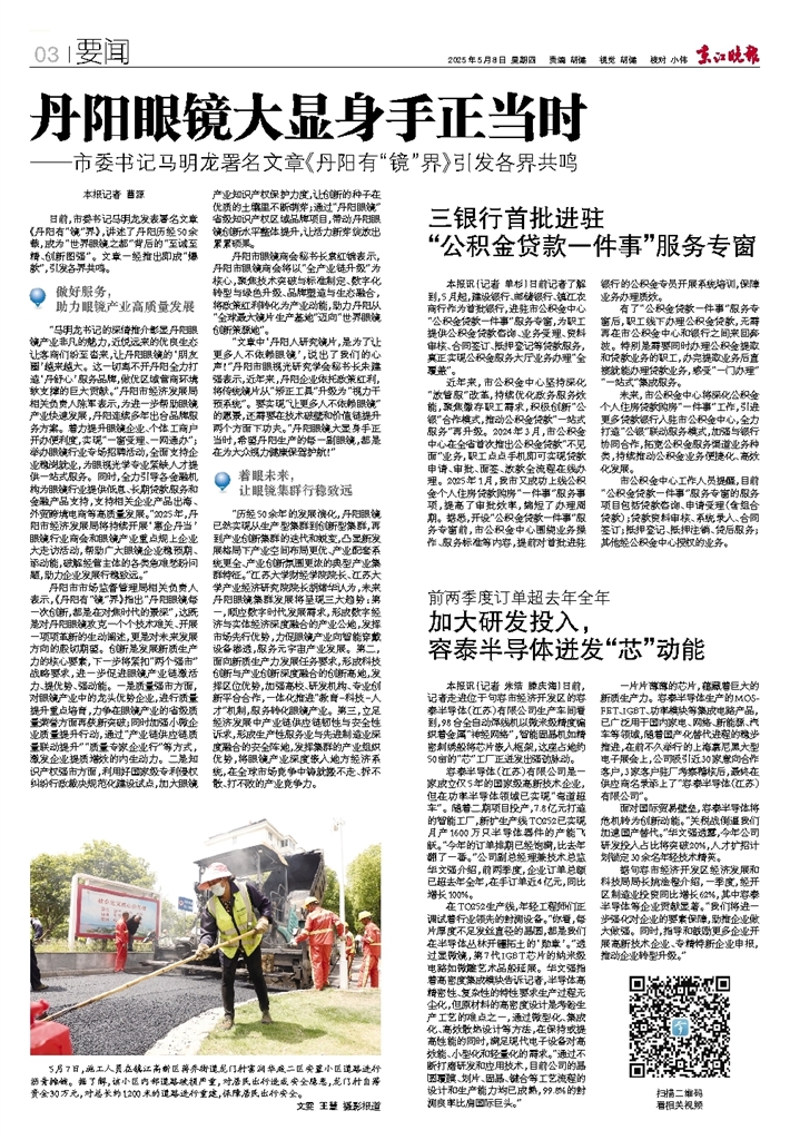 - 丹阳眼镜大显身手正当时 本报记者 曹源 日前,市委书记马明龙发表署名文章《丹阳有“镜”界》,讲述了丹阳历经50余载,成为“世界眼镜之都”背后的“至诚至精、创新图强”。文章一经推出即成“爆款”,