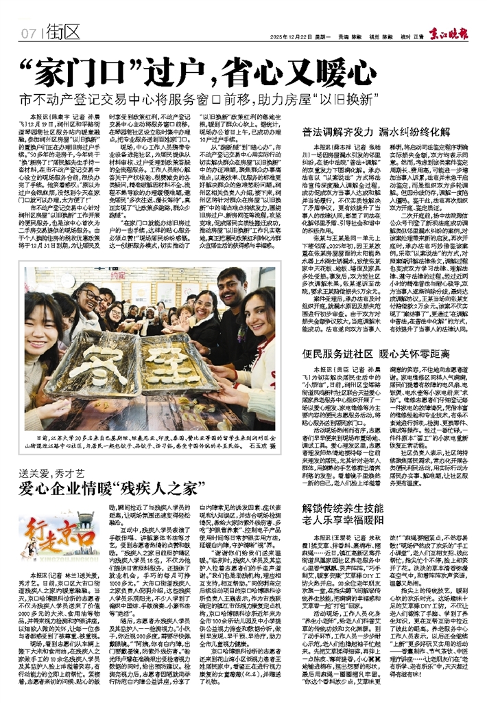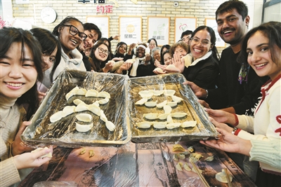 日前,江苏大学20多名来自巴基斯坦、坦桑尼亚、印度、泰国、赞比亚等国的留学生来到润州区金山街道迎江路中心社区,与居民一起包饺子、品饺子、话习俗,感受中国传统的冬至民俗。石玉成 摄