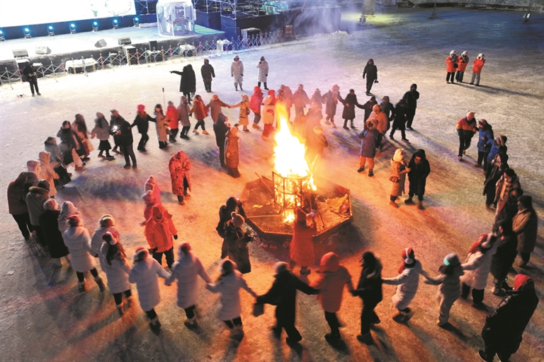 12月21日,漠河第十六届冬至文化节在黑龙江省漠河市北极村举行,民俗体验、美食文化等丰富多彩的活动吸引众多游人。图为游人在北极村参加篝火晚会(无人机照片)。 新华社发