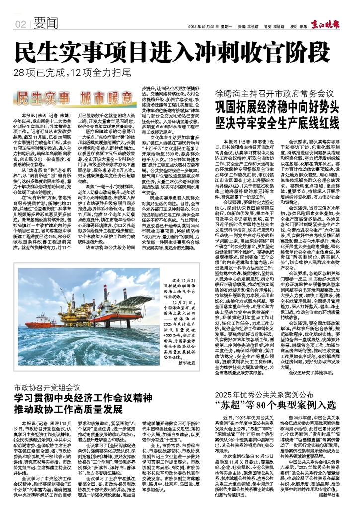 - 巩固拓展经济稳中向好势头 坚决守牢安全生产底线红线 本报讯(记者 陈志奎)近日,市长徐曙海主持召开市政府常务会议,认真学习贯彻中央经济工作会议精神,听取全市信访工作、安全生产工作和大运河生态环境保护专项督察及全市生态环保工作情况汇