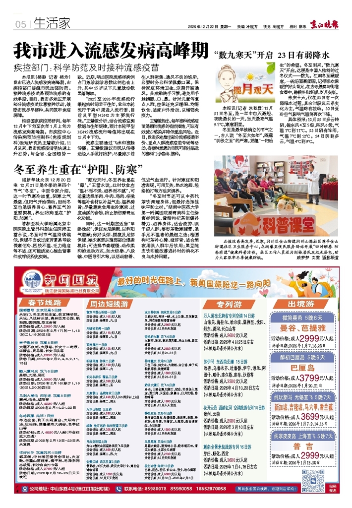 - 图片新闻 正值流感高发季,近期,润州区金山街道润州山路社区携手金山街道社区卫生服务中心,在润馨里便民服务驿站开展“四时颐养 防感有道”健康科普活动。社区工作人员还为到场居民发放足浴包,助力大家筑牢冬季健康防