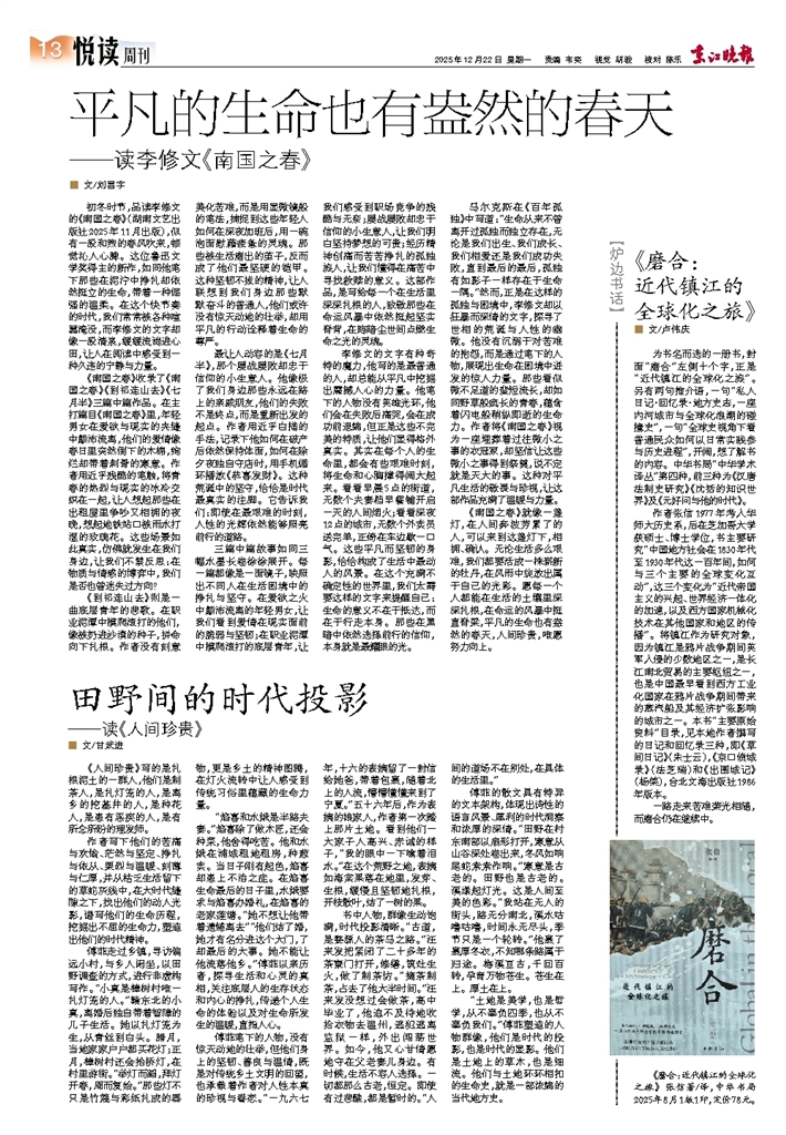 - 平凡的生命也有盎然的春天 ■ 文/刘昌宇 初冬时节,品读李修文的《南国之春》(湖南文艺出版社2025年11月出版),似有一股和煦的春风吹来,顿觉沁人心脾。这位鲁迅文学奖得主的新作,如