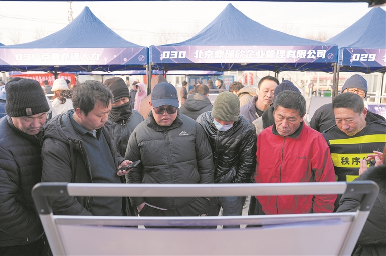 1月9日,求职者在马驹桥零工市场参加专场招聘会。当日,北京市人力资源和社会保障局在北京马驹桥零工市场组织开展“暖冬送岗 双节稳工”专场招聘会,62家企业现场提供招聘岗位3000余个。“暖冬送岗 双节稳工”专项活动是北京市破解节日用工难题的一项具体举措,也是推进零工市场规范建设、服务升级的实践。 新华社发