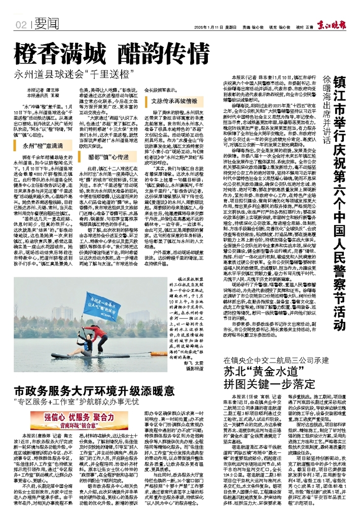 - 橙香满城 醋韵传情 本报记者 谭艺婷 本报通讯员 王璨 “永”冲锋“橙”意千里。1月10日下午,永州道县球迷会“千里送橙”活动抵达镇江。从高速出口接站,到丹徒区人民广场列队欢迎,“阿永