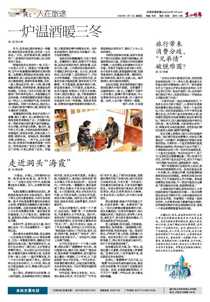 - 一炉温酒暖三冬 ■ 文/汪小科 冬日,在异地出差的我路过一排餐馆,嗅到浓浓的饭菜香,并没有一头扎进去。“天冷,进来喝碗冬酒,暖暖身吧!”一家酒馆外迎客员的暖心话,却把我迎了进去。